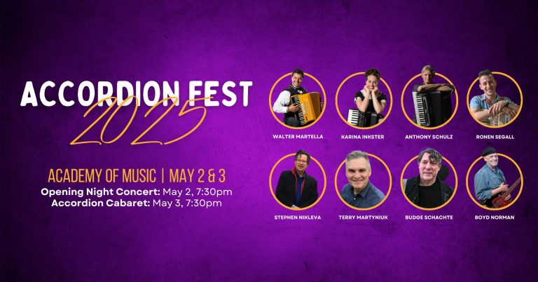 May 2 & 3. Walter Martella and Karina Inkster, along with the Academy of Music, present the 4th annual Accordion Fest! Featuring two concert performances, workshops for beginners and advanced players alike, and a wide range of musical genres for our audiences to enjoy, join us to celebrate one of the world’s most versatile instruments!