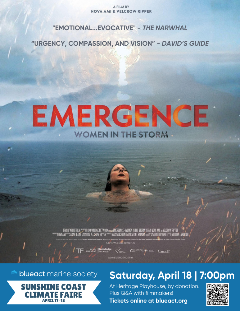 Apr 18 • Gibsons 7:00pm–9:00pm • Heritage Playhouse: Screening of ‘EMERGENCE: Women in the Storm’ | Sunshine Coast Climate Faire Free Heritage Playhouse: Screening of ‘EMERGENCE: Women in the Storm’ | Sunshine Coast Climate Faire