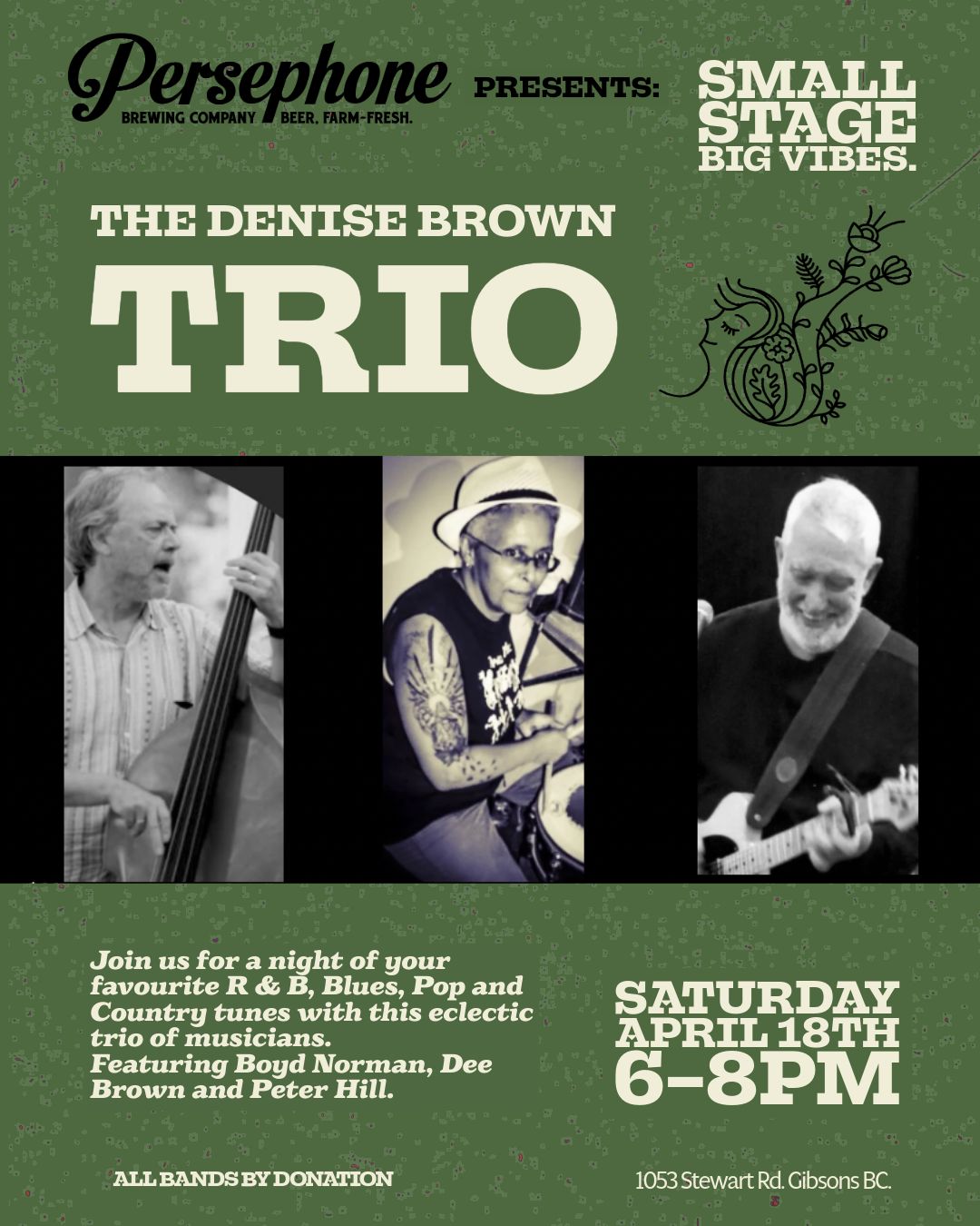 Boyd Norman - bass/vocals,Peter Hill - guitar/vocalsand Denise Brown-guitar/vocals/drums. Blues, RnB and even a little countrya decent repertoire including covers of Tracy Chapman, Marvin Gaye, Shaboozy, Prince, the Beatles and more.