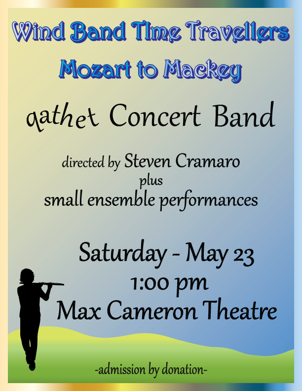 Afternoon concert presented by qathet Concert Band. Directed by Steven Cramaro including small ensemble performances. Saturday, May 23rd, 1:00 pm, Max Cameron Theatre, Powell River. admission by donation