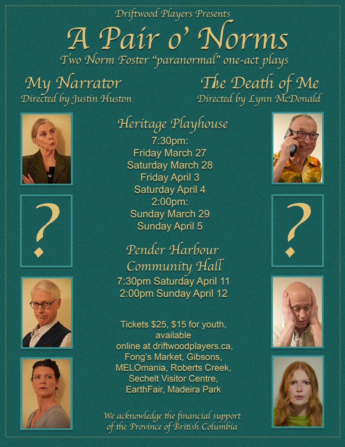 Two Norm Foster “paranormal” one-act plays: The Death of Me When John bargains with the Angel of Death for a second chance at life, he quickly discovers that fixing the mistakes of your past is difficult, and that perhaps his destiny is not yet etched in stone. Directed by Justin Huston My Narrator Imagine what […]