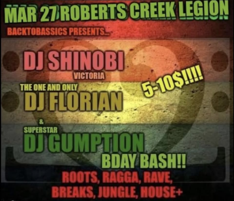 Superstar DJ Shinobi from Victoria, Florian, local legend, and myself, gumption - my bday bash. We've got breaks and jungle and house, roots and culture all night long.