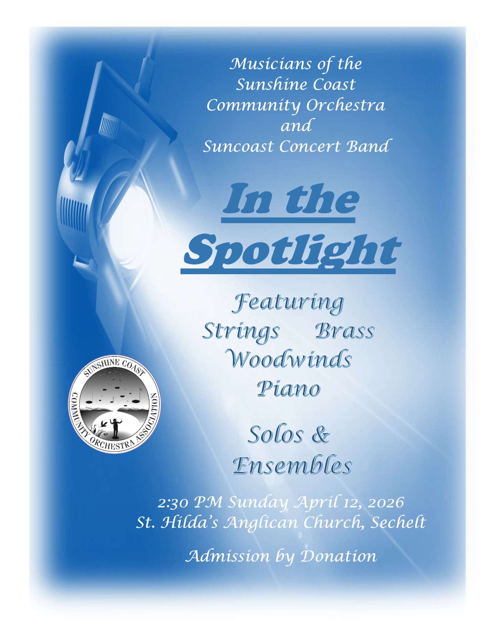 Members of the Suncoast Concert Band and Sunshine Coast Community Orchestra perform individually and in small ensembles of brass, woodwind and string instruments. 2:30 PM Sunday April 12 - St. Hilda's Anglican Church, Sechelt - Admission by Donation